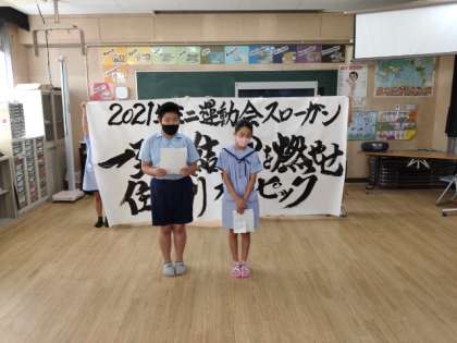 本日、児童会からミニ運動会のスローガン発表がありました。