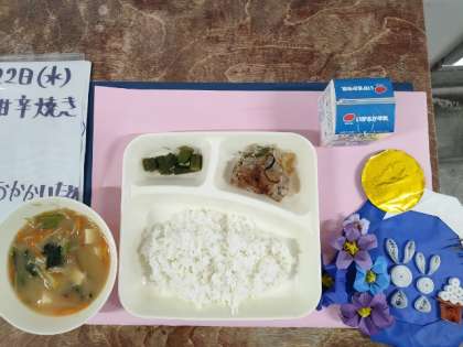 今日のメニューは、豚肉の甘辛焼き・みそ汁・オクラのおかかいため・ごはん・牛乳でした。