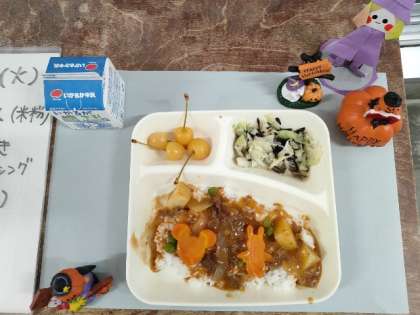 今日のメニューは、ハヤシライス[米粉]・キャベツのひじきドレシング・さくらんぼ(缶)でした。