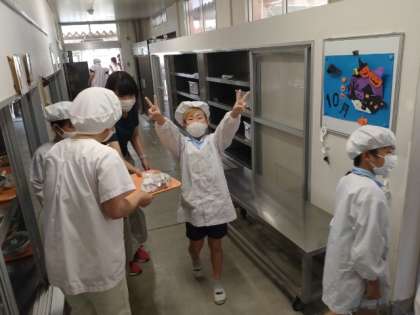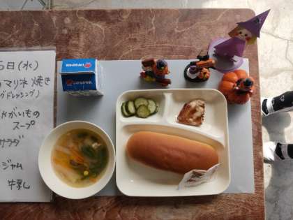 今日のメニューは、かつおのマリネ焼き[ノンエッグドレッシング]・鶏肉とじゃがいものスープ・パン・牛乳でした。