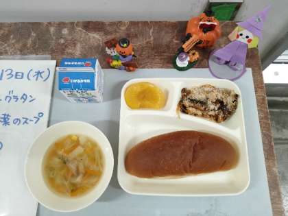 今日のメニューは、なすのミートグラタン・鶏肉と野菜のスープ・黄桃(缶)・パン・牛乳でした。