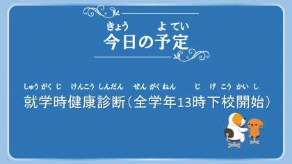 就学時健康診断のため、全学年給食後、13時から下校を開始します。