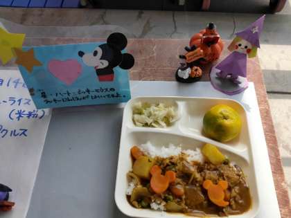 今日のメニューは、ポークカレーライス[米粉]・キャベツのピクルス・みかん・牛乳でした。