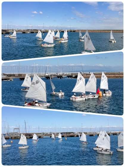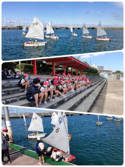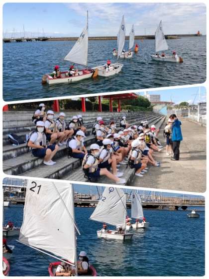 秋晴れの青空の下で、みんな楽しそうにヨットを操縦しています。