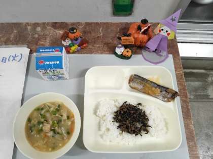今日のメニューは、さんまのみぞれがけ・みそ汁・牛ひじきそぼろ・ごはん・牛乳でした。