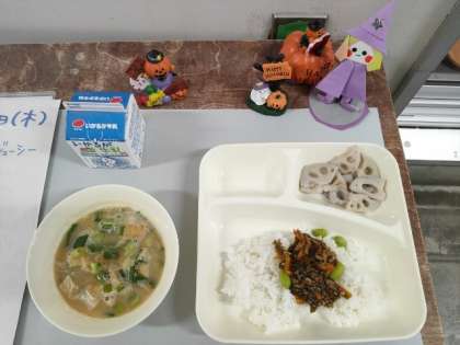 今日のメニューは、もずくと豚ひき肉のジューシー・さつまいものみそ汁・焼きれんこん・ごはん・牛乳でした。