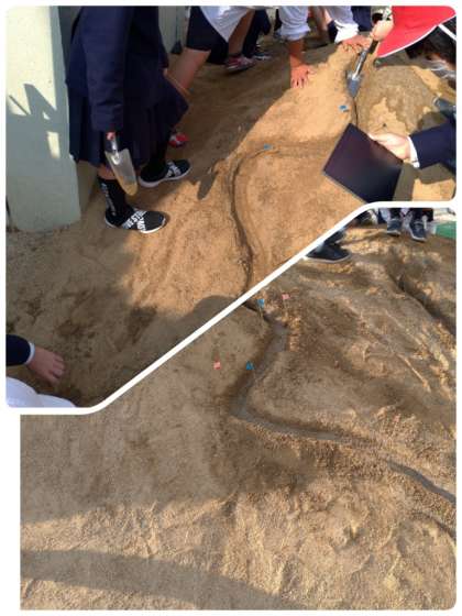 築山に流路を作り、内側と外側に目印を立て、上流から水を流し、内側・外側の流速や地面を削る働きについて観察をしていました。