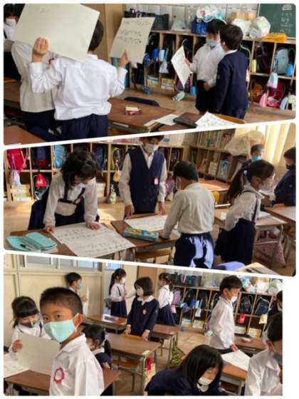 国語科「いろいろなふね」で「〇〇は〜するための船です。」という言い方を学習しました。この言い方を使って、「これはまちがったところを消すための文房具です。これは何でしょう。」などという問題を作りました。それぞれのカテゴリーごとのパビリオンを回って、クイズを解いていきました。楽しく活動することができました。