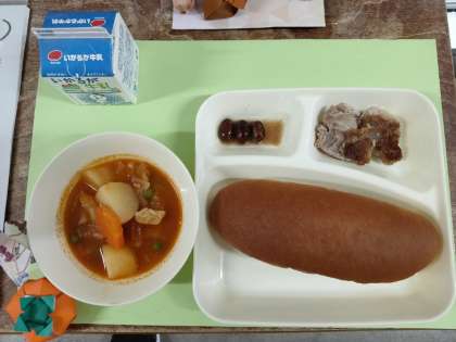 今日のメニューは、豚肉のガーリック焼き・ケチャップ煮・うずら豆のグラッセ・パン・牛乳でした。