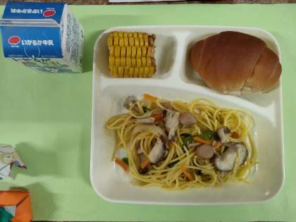 今日のメニューは、ウインナーときのこの和風スパゲッティ・焼きとうもろこし・固形チーズ・パン・牛乳でした。