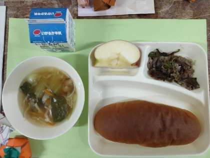 今日のメニューは、牛肉のオイスターソース焼き・中華スープ・りんご・パン・牛乳でした。
