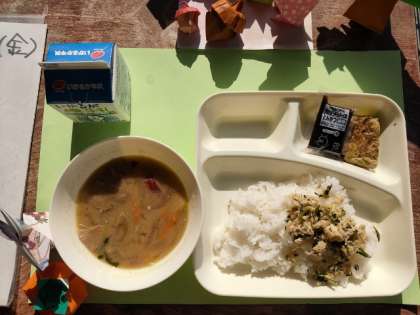 今日のメニューは、お好み焼き・豚汁・とりなっ葉いため・ごはん・牛乳でした。
