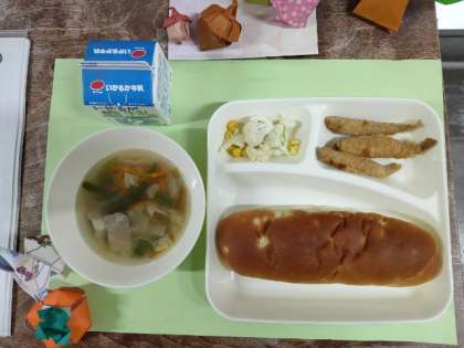 今日のメニューは、わかさぎフライ・スープ・カリフラワーとコーンのサラダ・パン・牛乳でした。