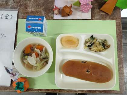 今日のメニューは、スープ煮・ほうれんそうのグラタン・白桃(缶)・パン・牛乳でした。