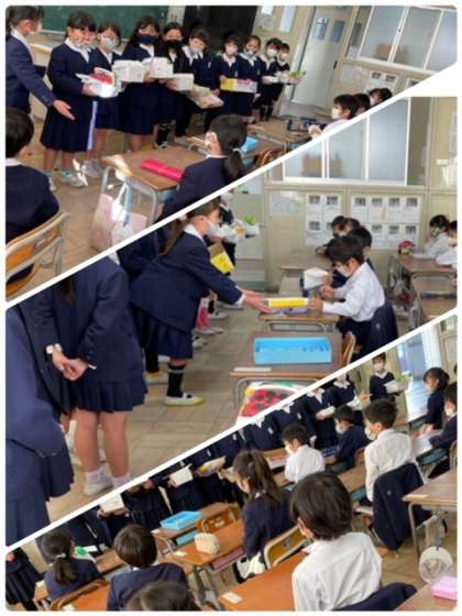 2年生が生活科で身近な材料を使って作ったおもちゃを1年生にプレゼントしてくれました。これから1年生は、2年生が準備してくれた遊び方の動画を見て、たくさん遊ぶ予定です。2年生ありがとうございます。