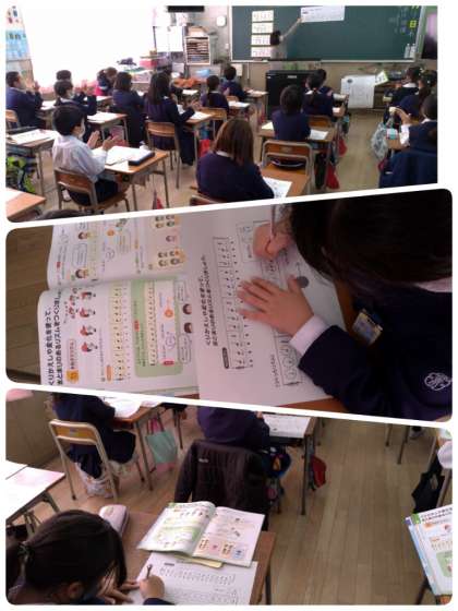 4分音符と8分音符を使い、各自オリジナルのリズムをつくりました。最後に2人1組になり、2人でリズムをつなげカスタネットで演奏しました。