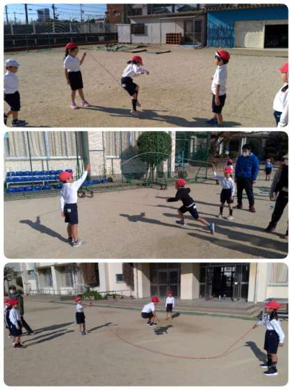大きな縄を回すのは難しいようでしたが、友達がとぶことができるように頑張る姿が見られました。