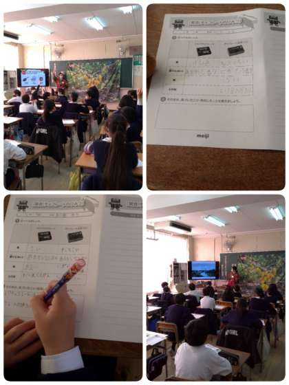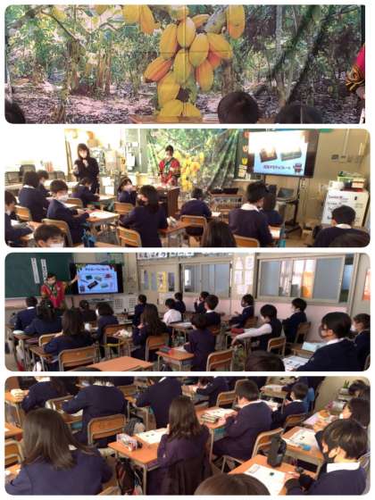 5年生の食育に関する授業の一環として、明治の方に来ていただき、「明治カカオ・チョコレート教室」を受けました。