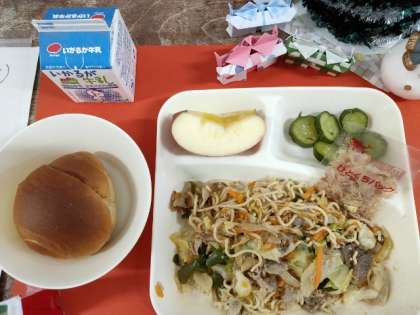 今日のメニューは、和風焼きそば・きゅうりのしょうがづけ・りんご・パン・牛乳でした。