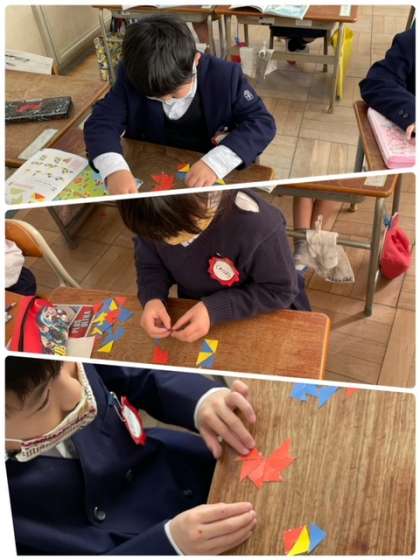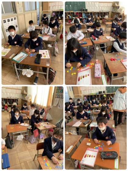 算数科で「形つくり」の学習をしています。三角形の色板を使っていろいろな形を作りました。家やロケットなどを作っていました。