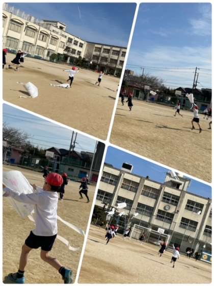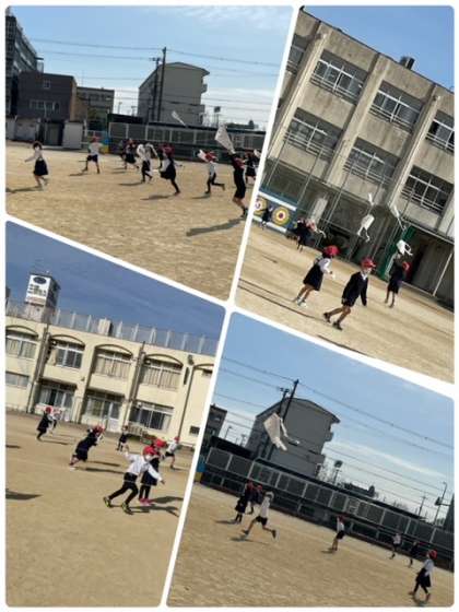 生活科の学習でたこを作りました。作ったたこを運動場であげました。風にのせてたこを高くあげていました。とても楽しそうにあげていました。