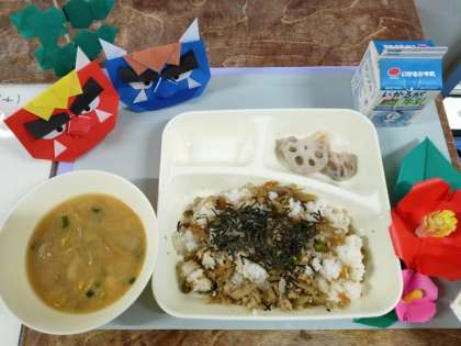 今日のメニューは、鶏ごぼうご飯・みそ汁・焼きれんこん・牛乳でした。