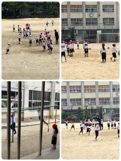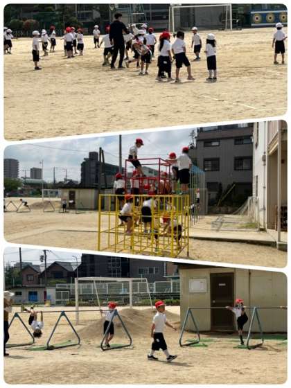 今日の2時間目は体育でした!1・2組は運動場、遊具遊びと転がしドッジボールを、交代交代でしました!遊具遊びでは、ジャングルジムやうんていや登り棒を楽しみました!転がしドッジボールは、迫ってくるボールをサッと横によけたり、ジャンプしてよけたり、楽しみました!3組は体育館で、進化ジャンケンでゴキブリ歩きやゴリラ歩きを楽しみました!そのあと、ダッシュやケンケンなど体ほぐし運動を楽しみました!昨日、雨であまり体を動かせなかった分、存分に運動を楽しみました!