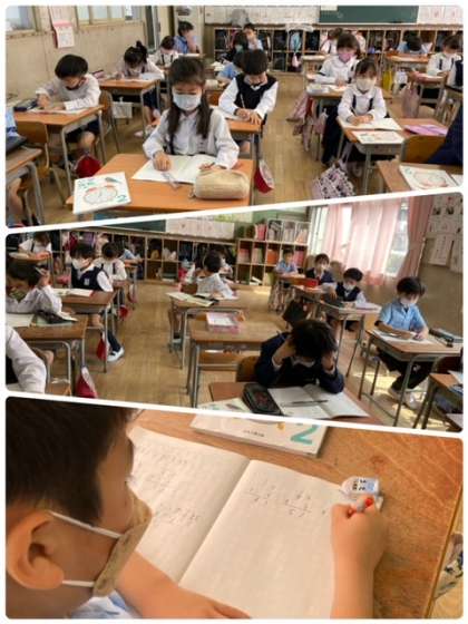 算数科で足し算の筆算の学習をしています。位をそろえて、一の位から計算をしています。繰り上がりに気を付けて計算しています。みんながんばっています。