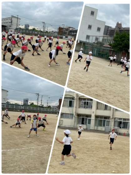 2年生の体育で、いろいろなかけっこを学習しています。まっすぐ走ったり、スキップしたり、ボールを使ったりして力いっぱい体を動かしています。楽しみながら運動していました。