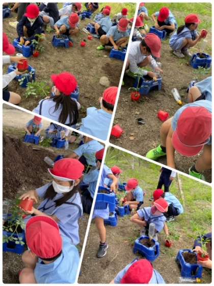 生活科の学習で野菜を育てます。トマトの苗が届いたので、鉢に植えかえました。「元気に育ってね。」「おいしいトマトを見につけてね。」と声掛けしながら、水やりをしていました。