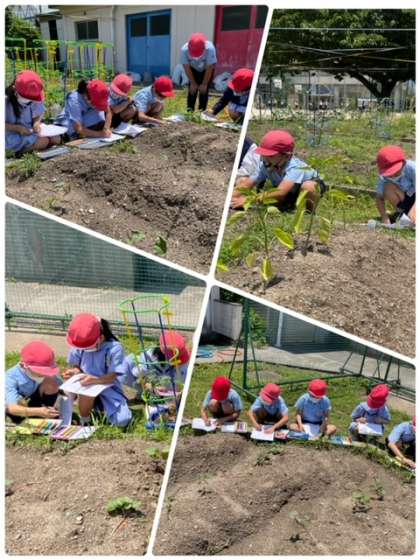 2年生は、学習園で野菜を育てています。サツマイモ、ピーマン、オクラ、ナス、キュウリを育てています。それぞれの野菜を観察しました。葉の大きさがちがうな、茎の色がちがうな、などと比べながら観察していました。