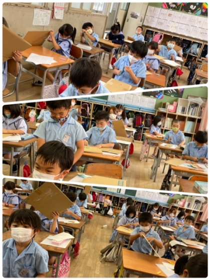 段ボールを手でちぎったりはさみで切ったりして、何かの形に見立てました。「ぶたの顔に似てるな。」「怪獣みたい。」などと言って楽しく活動していました。