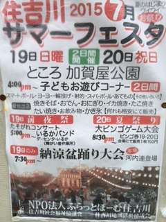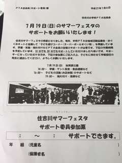 19日(日)は住吉川サマーフェスタです。毎夏、PTA・はぐくみネット・地域活動協議会と連携して「子どもの遊びコーナー」を運営しています。PTA全会員様の参画・協力が必要です。時間の許すかぎり子どもたちと共に活動をしてください。よろしくお願いいたします。