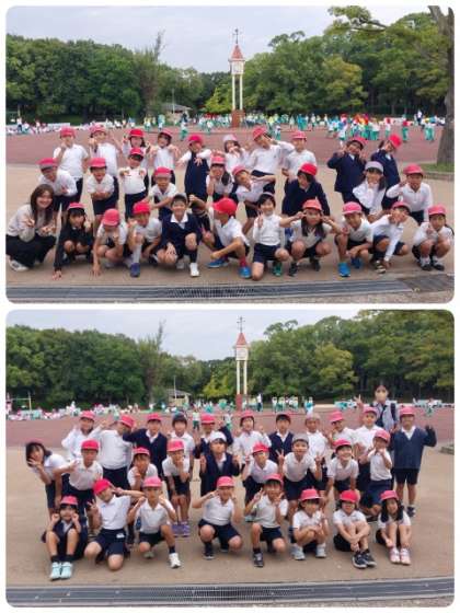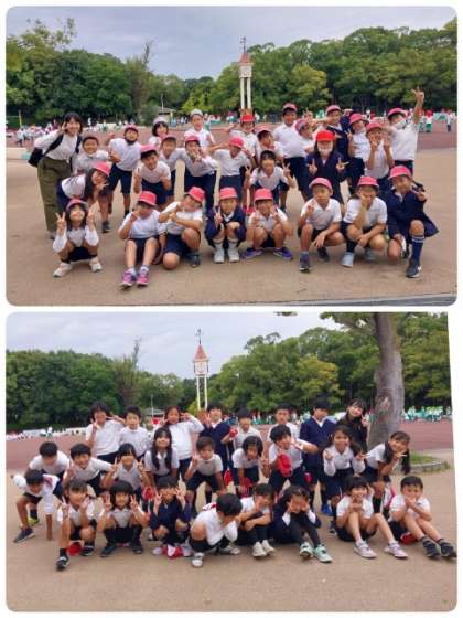昼食後、わんぱくランドに移動し、学級ごとに集合を撮りました。