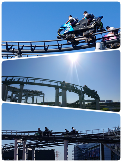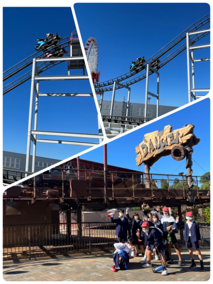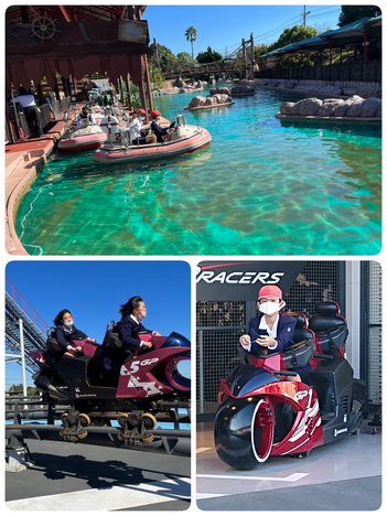 楽しく乗り物に乗り、お昼ごはんを食べています。