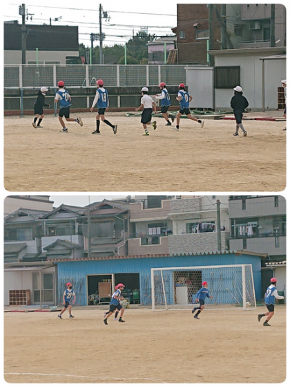 チームに分かれてボールに向かってガンバっている姿が印象的です。