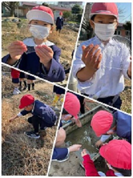 校庭に出て、冬を探しました。氷が張っているのを見つけました。氷の厚さは5ミリメートルくらいありました。桜の木は花も葉もないけれど、つぼみが少しふくらんでいます。春の準備をしているんですね。