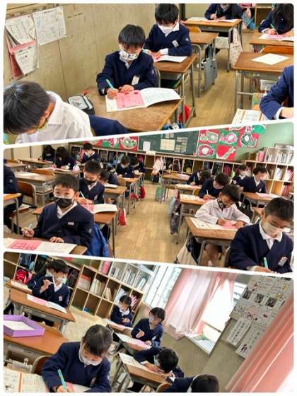 水書用紙に水をつけた筆を使って、点画の書き方を確かめました。姿勢をよくして、丁寧に書く練習をしました。