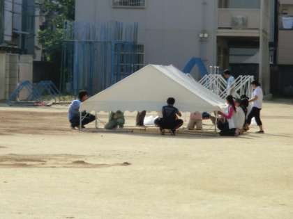 山土をブラシでならして、テントを立てています。