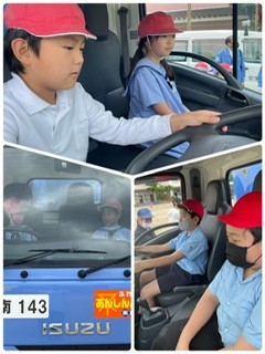 清掃車(パッカー車)の運転席でハンドルを握ったり、ゴミが