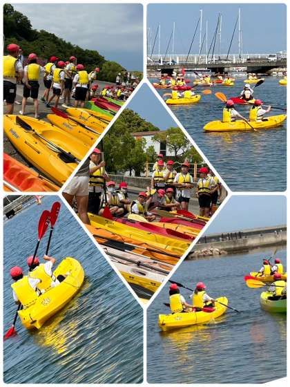 今日の海の活動カヌーです。みんな楽しみにしてました。半分に別れて館内のオリエンテーリングをしました。