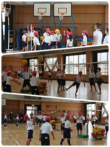ソフトバレーボールの授業で、しっかりとボールをつなぎ、