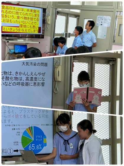 環境問題について考えました。問題点を見つけ、どのような対策があるかなど、調べて分かったことをまとめ、パワーポイントで発表しました。資料をのせて、わかりやすくまとめ発表することができました。