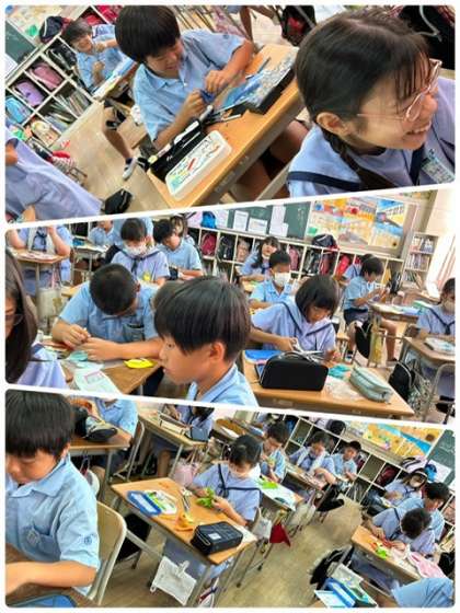 家庭科で、なみ縫いや本返し縫い、かがり縫いなど、いろいろな縫い方を学習しました。学習したことを生かして、小物を作っています。デザインを考えて、楽しく活動しています。どんなすてきな小物が出来上がるか楽しみです。