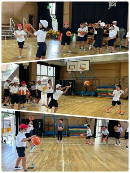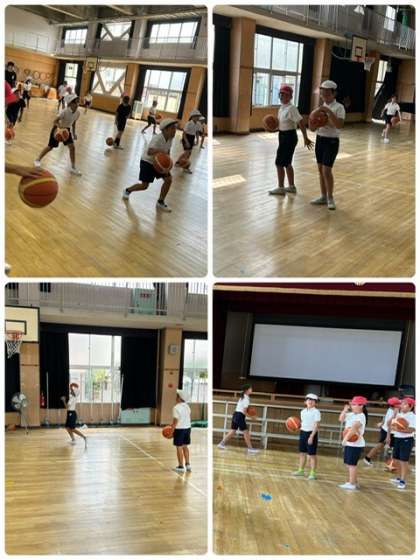 体育でバスケットボールを学習しています。ドリブルやレイアップシュートなどを練習しました。こつをつかんで、シュートがきまるようになってきました。みんながんばっています。