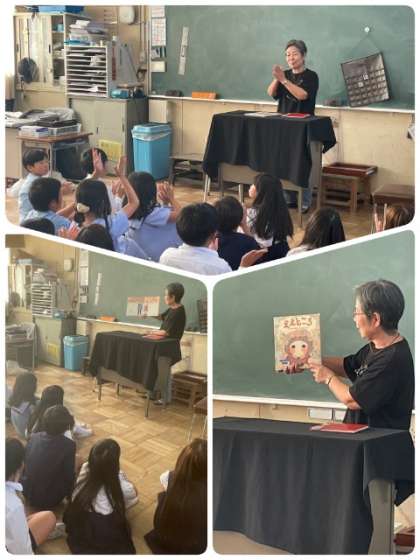 3年生のおはなし会では、「組木 ももたろう」「絵本 グーチョキパーのうた」「紙芝居 ふるやのもり」「絵本 なぞなぞはじまるよ」「絵本 ええところ」の読み聞かせをしていただきました。