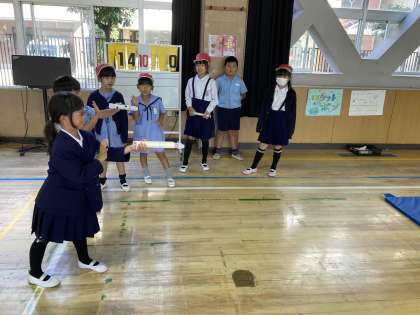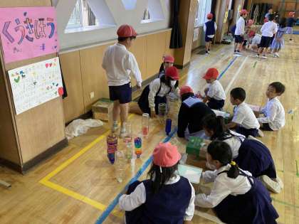生活科で作った「うごくおもちゃ」を使って1年生と一緒に遊びました。得点を競ったり、的を狙ったり、遊び方を工夫し、みんなで楽しく遊ぶことができました。
