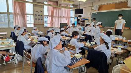 今日の献立は、煮込みハンバーグ、野菜スープ、ミニフィッシュ