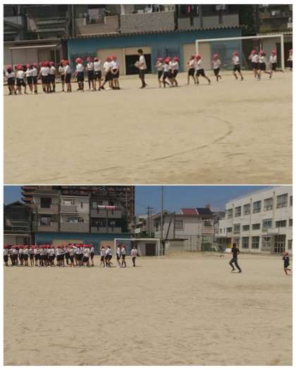 火災を想定した訓練で、グラウンドへ避難し、点呼