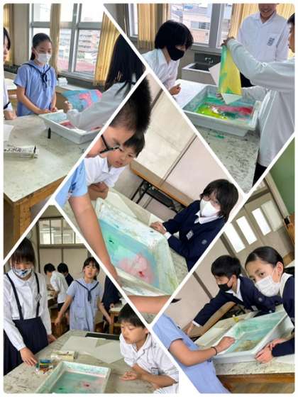 図画工作科の学習でマーブリングをしました。思いがけない模様ができて楽しく活動することができました。きれいな色合いの模様ができました。